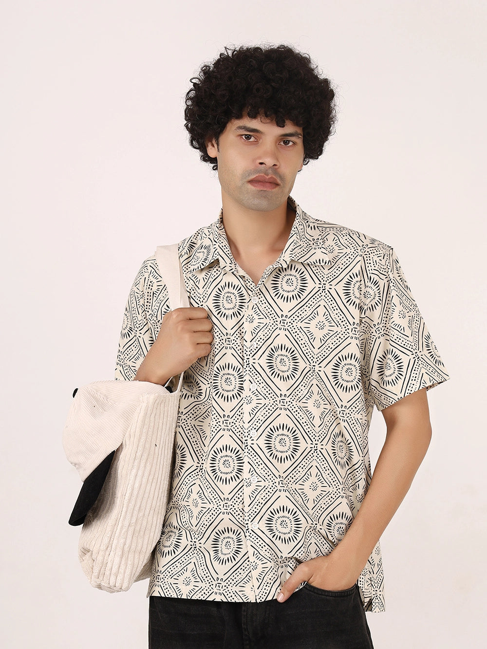 The off-white base is paired with bold black geometric motifs, giving the shirt a modern tribal-inspired vibe. Featuring relaxed fit, it brings effortless cool to your resort wardrobe, beach outings, or everyday casuals. Pair it with denim, shorts, or linen trousers for a polished yet laid-back look.